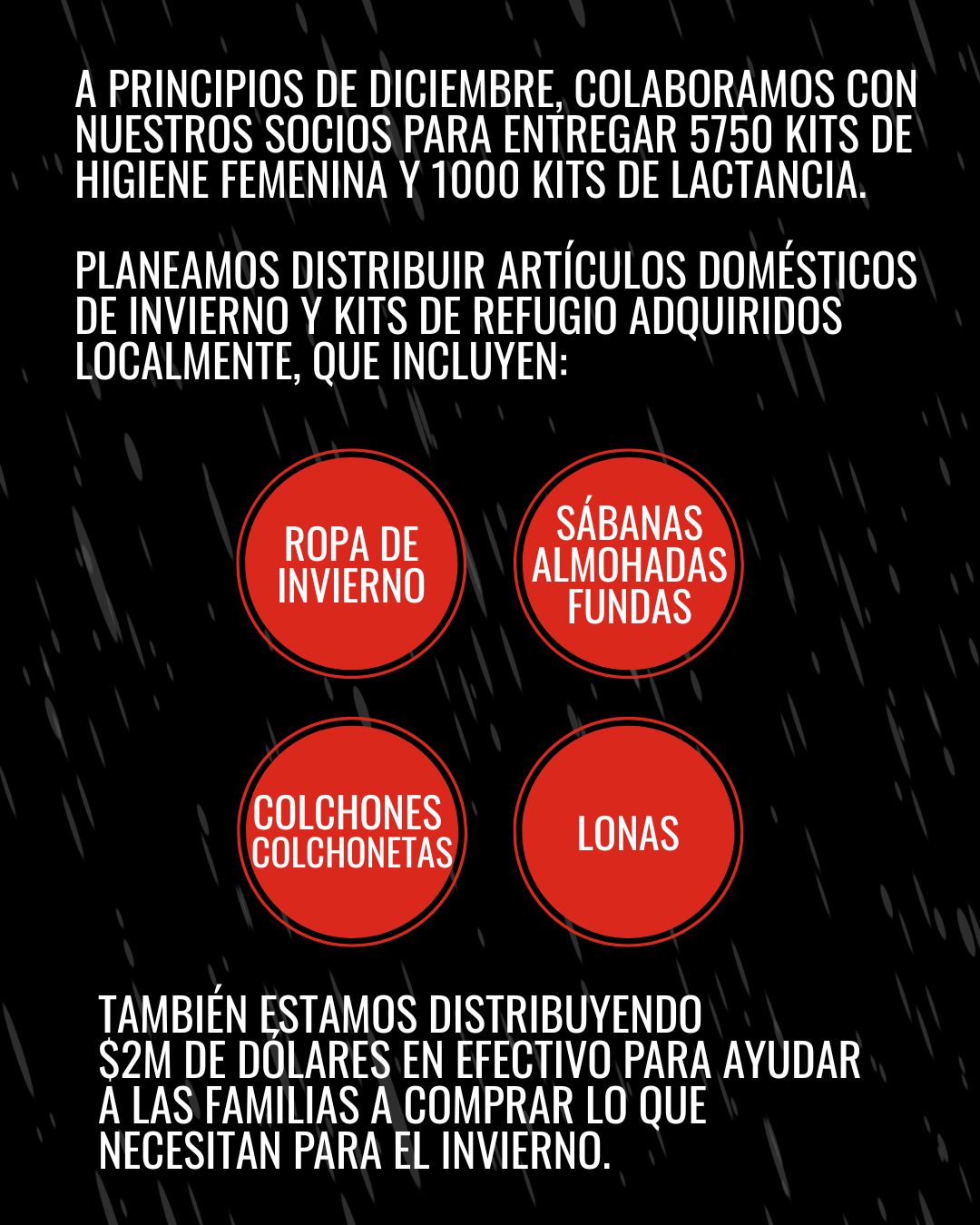 Brindaremos 300 kits de alimentos, 300 kits de higiene, 300 kits de dignidad y 50 tarjetas de asistencia en efectivo.