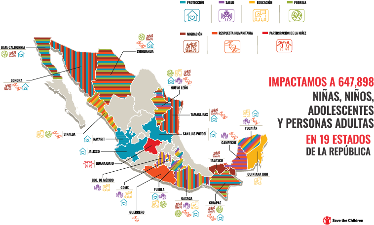 Llevamos nuestras acciones a 9 estados: Baja California, Chiapas, Chihuahua, Guerrero, Oaxaca, Puebla, Sinaloa, Sonora y Yucatán. Cada niña y niño merece crecer con protección y oportunidades.